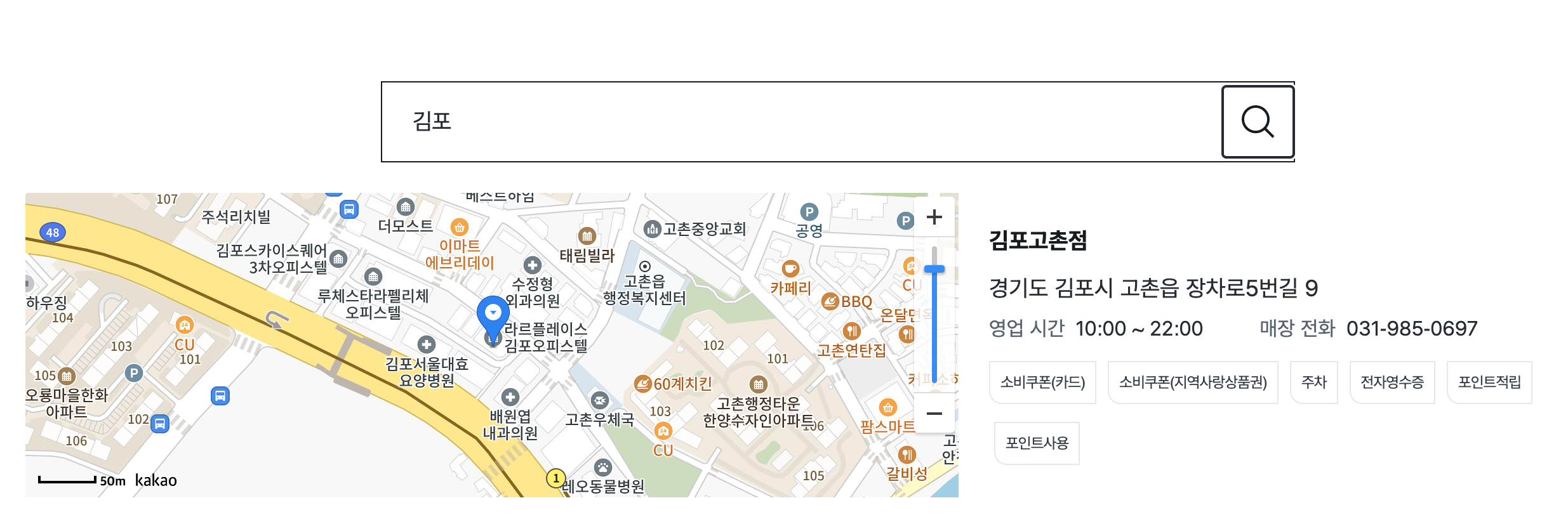 - 매장명 또는 지역을 입력 후 돋보기 버튼을 클릭합니다.