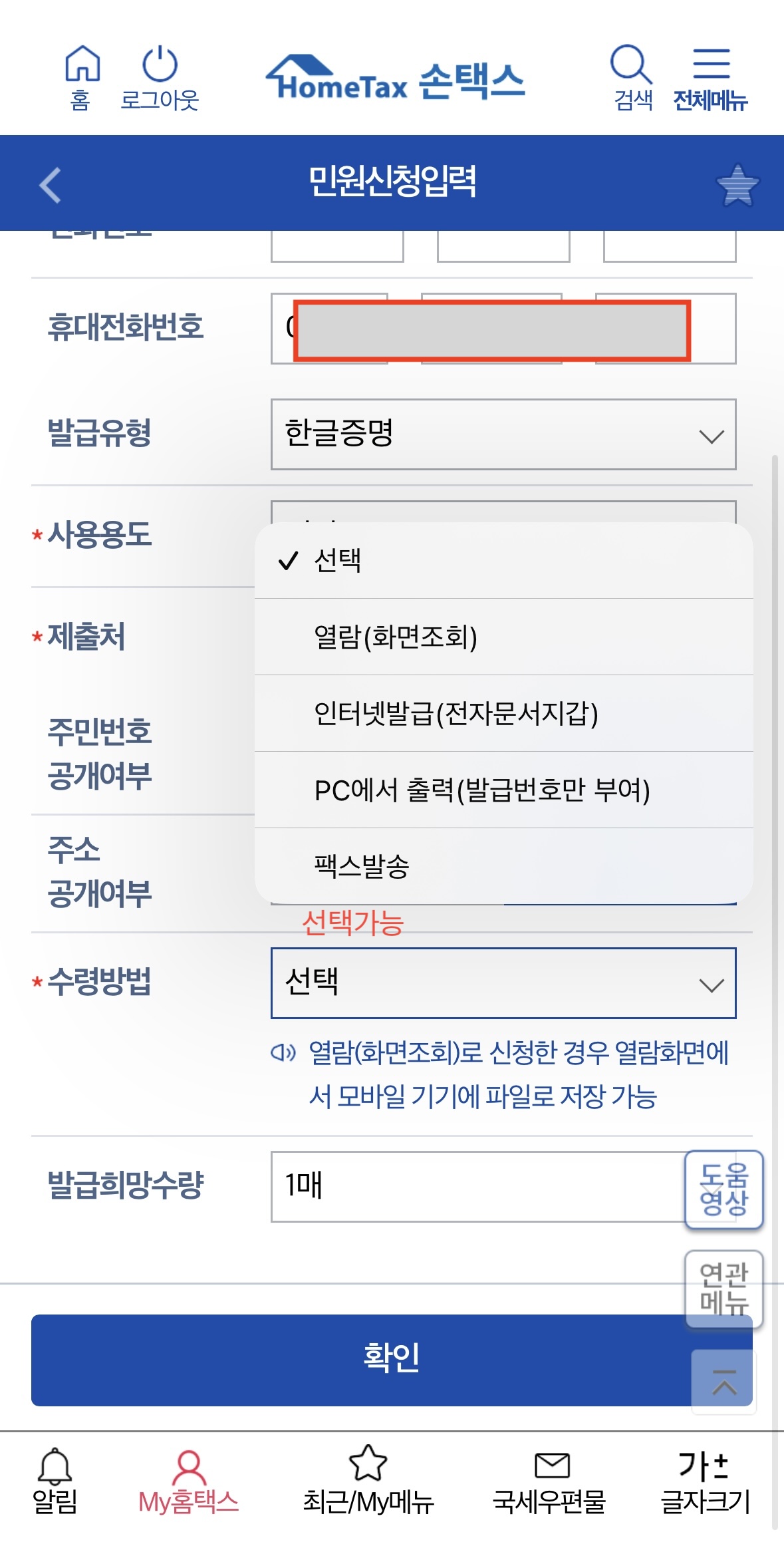 - [발급신청] 후 PDF로 출력하거나 프린트로 인쇄