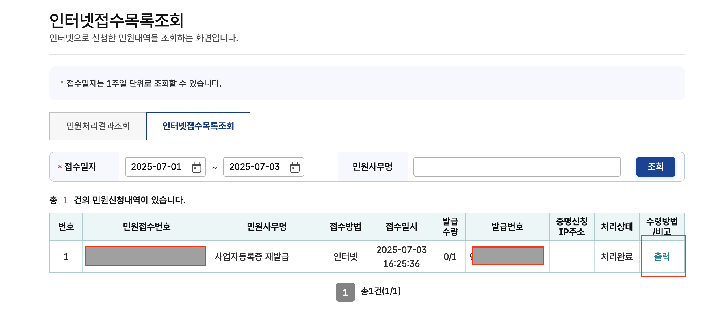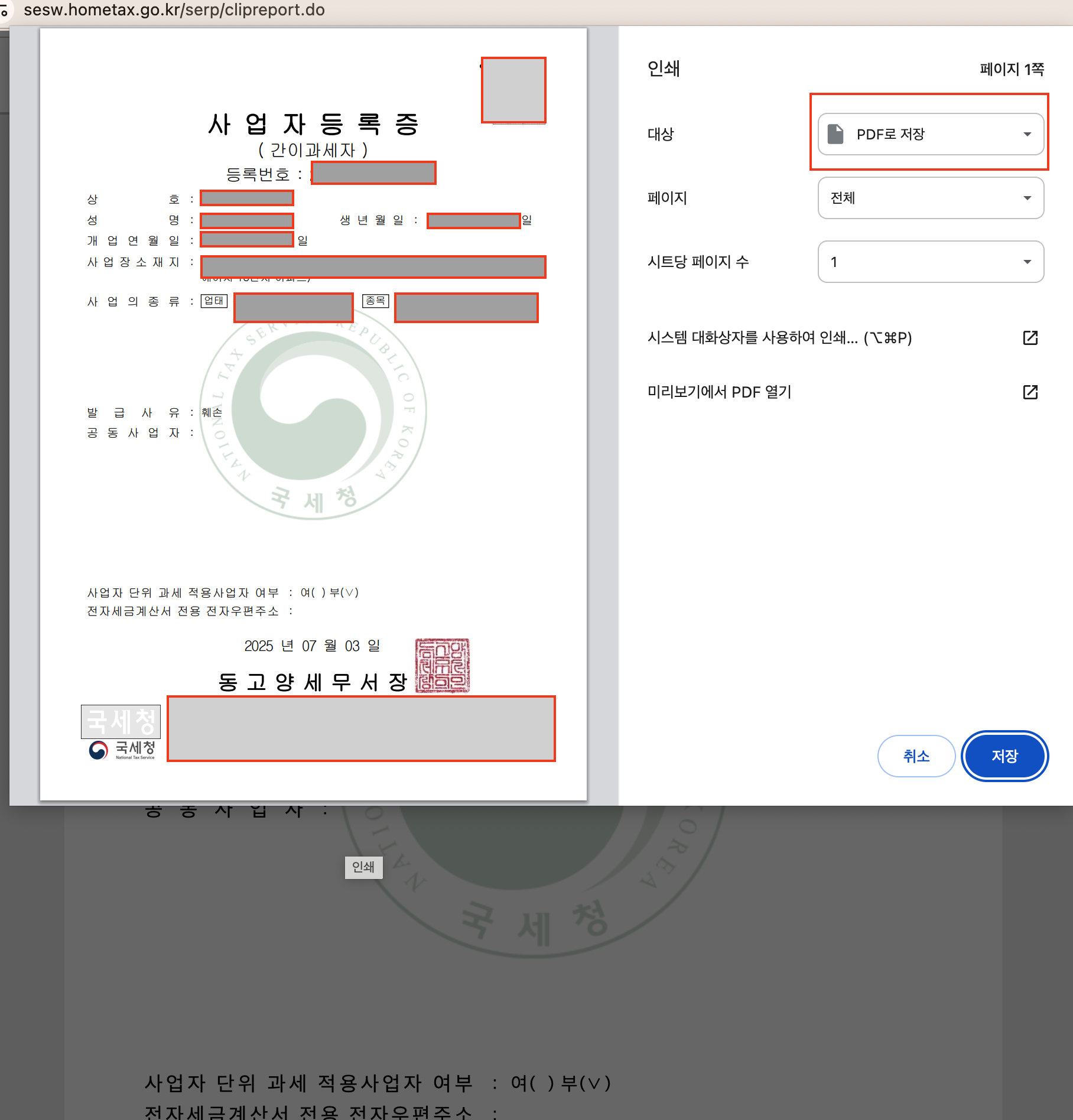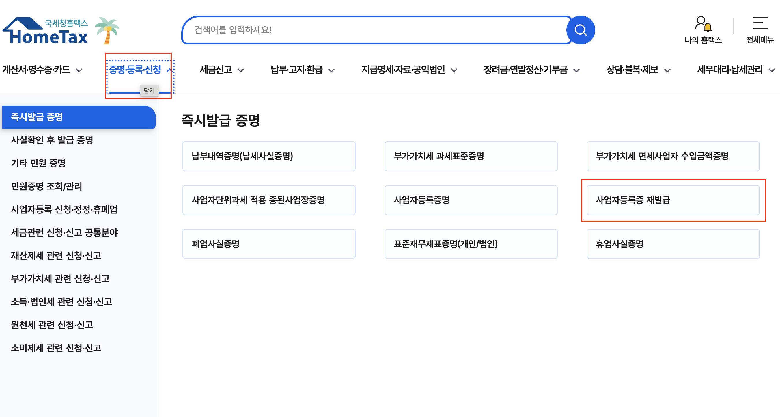 - [사업자등록증 재발급] 선택 후 본인 사업장 조회
