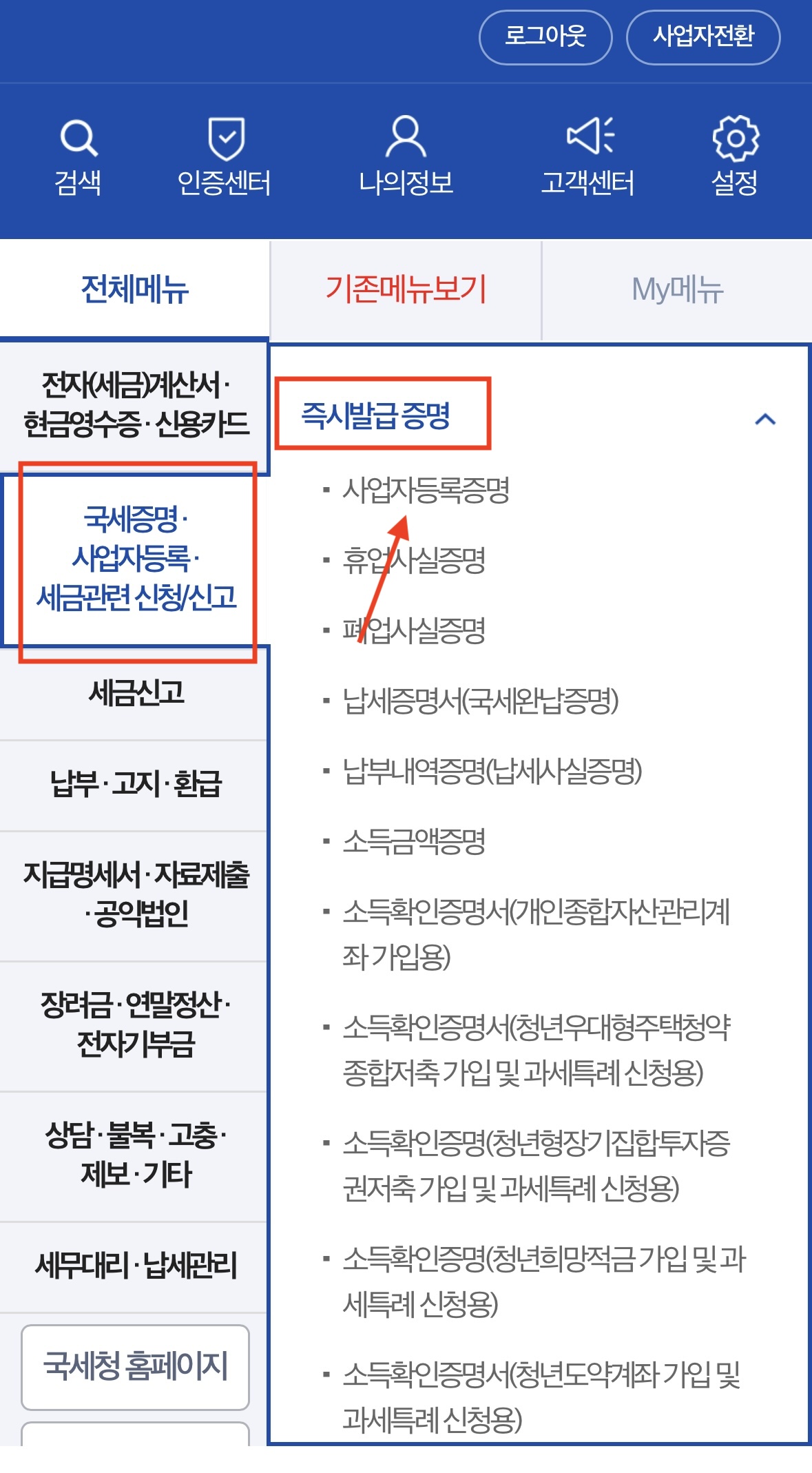 - 로그인 후 [민원증명] → [사업자등록증명] 선택