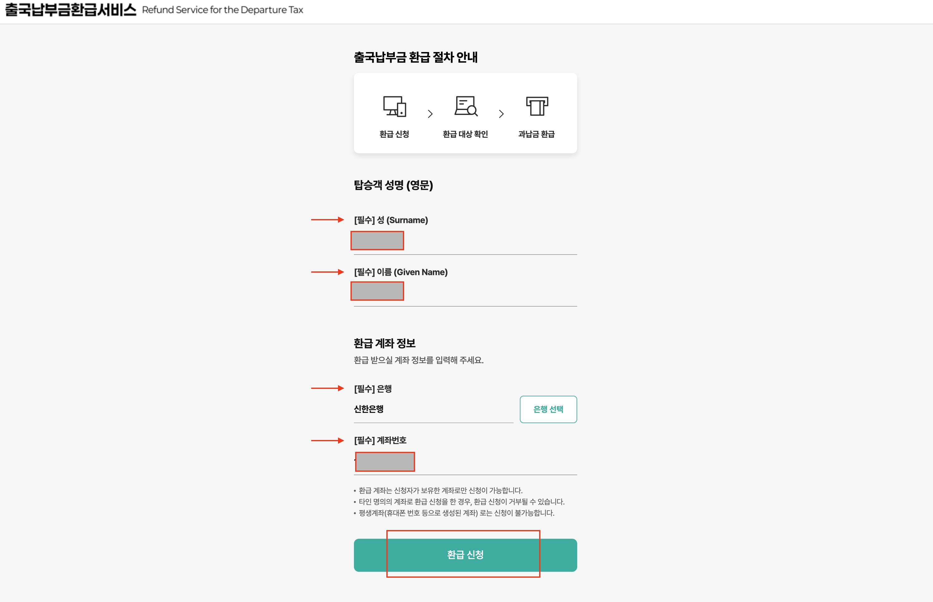 환급 받을 계좌 정보를 입력합니다. 본인 명의 계좌만