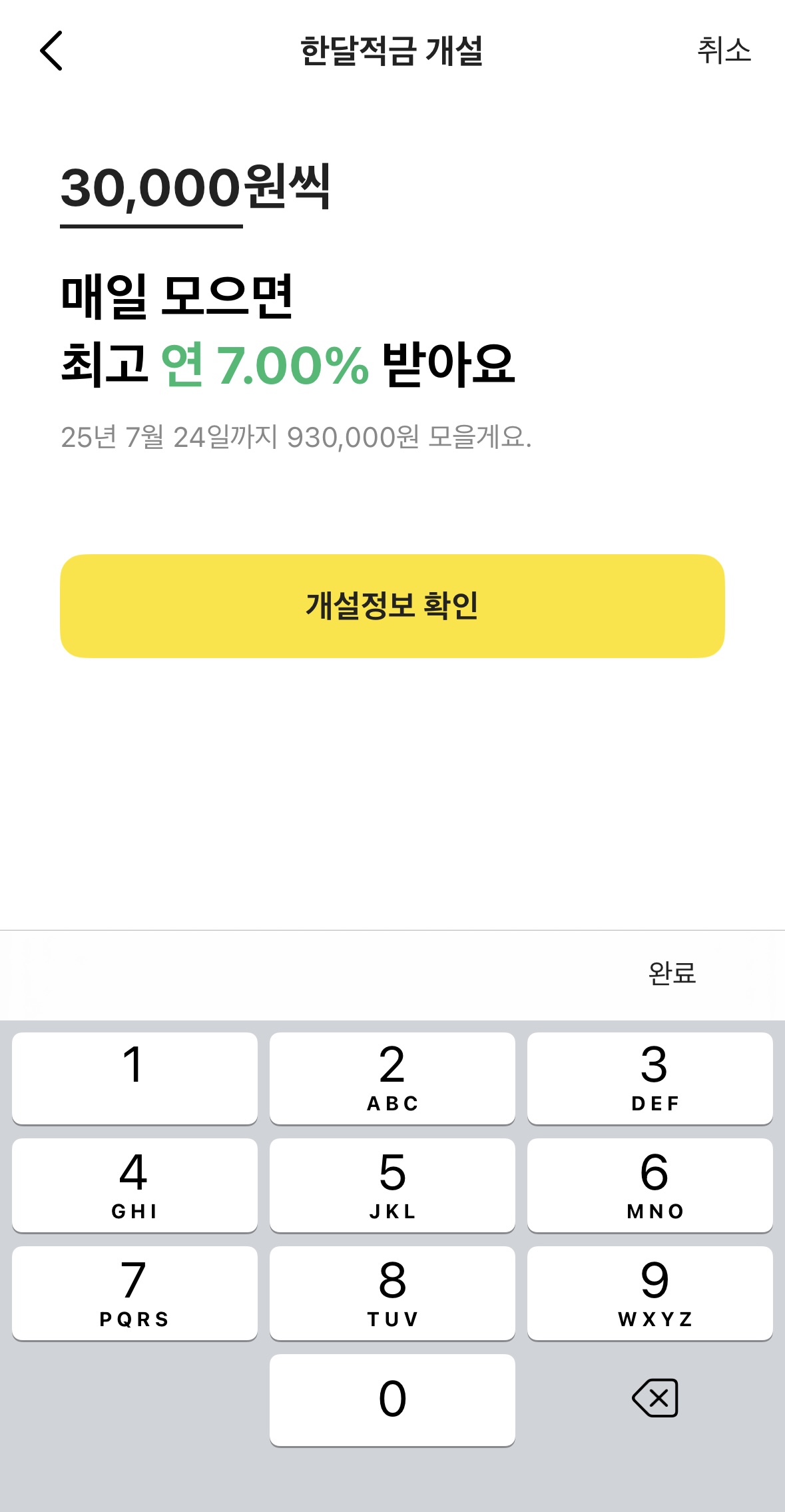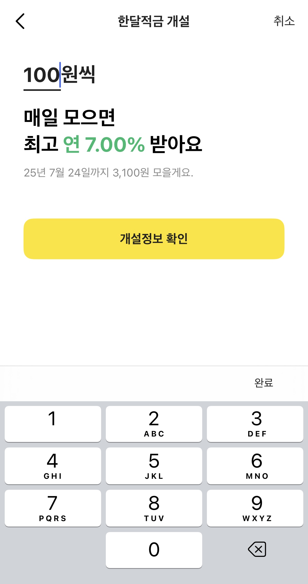 전체 약관에 동의한 후 ‘다음’ → ‘확인’을 누르면 한달적금 계좌가 개설됩니다. 이후 매일 1회 직접 입금할 수 있는 화면이 생깁니다.