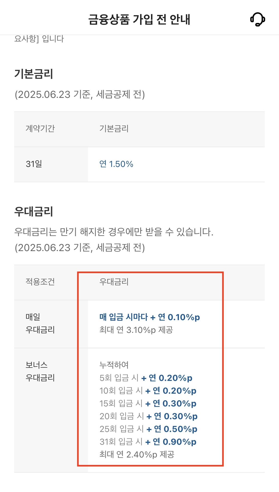 - 매일 1회 빠짐없이 입금: 매일 우대금리 +0.10%p 누적