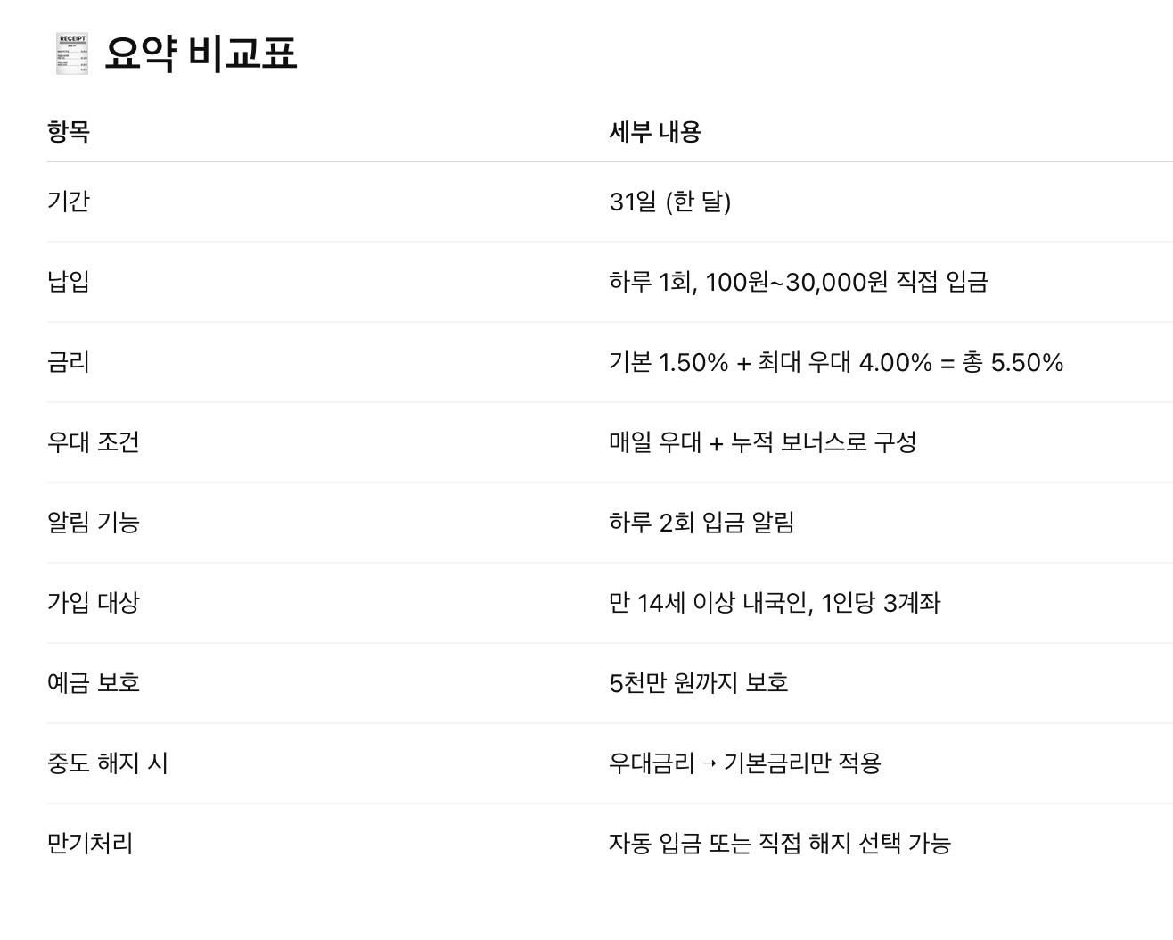 상품 상세 페이지에서 금리, 조건, 납입 방식 등을 꼭 확인하세요. 특히, 하루 한 번 직접 입금해야 한다는 점을 놓치지 마세요.