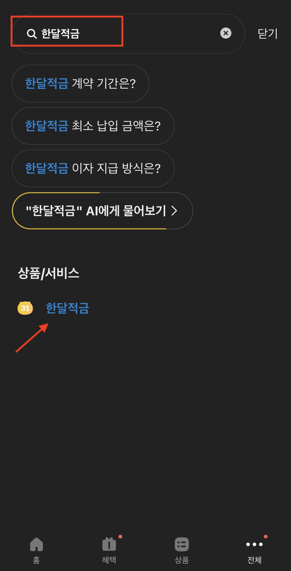 ‘추천 상품’ 또는 ‘예금/적금’ 메뉴에서 한달적금을 선택합니다. 최근에는 홈 화면에 배너로도 자주 노출됩니다.